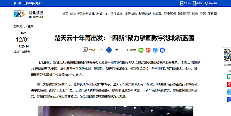 2025年,為深入貫徹落實習近平總書記考察湖北重要講話精神,加快推進數字湖北建設,做強做優做大全省數字經濟,湖北大數據集團正式成立,整合了省楚天云等數字產業平臺公司,投資建設全省數字基礎設施,匯集全省公共數據資源和重要行業數據,形成全省數據資源網絡。